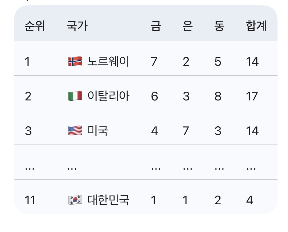 대한민국 주요 성과: 스노보드 김상겸 선수가 은메달을 획득하며 한국 선수단에 첫 메달을 안겼습니다! 이외에도 쇼트트랙과 스피드스케이팅에서 추가 메달 사냥을 이어가고 있다. 여자 스노보드 하프파이프애서 최가온 선수가 금메달을 따며 10년만에 스노보드 여왕 클로이 킴에서 최가온으로 올림픽 금메달의 주인이 바뀌기도 했다.